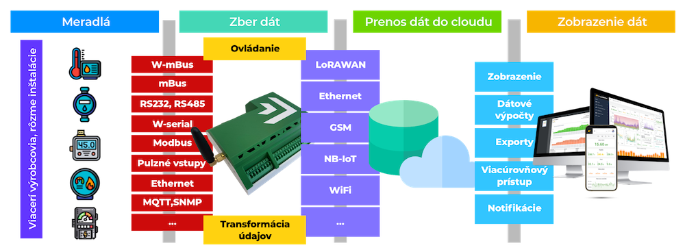 Riešenie pokrýva úplnu data-flow od meradiel až po Cloud - Energy Data Advizor. Pokiaľ meradlo či senzor podpurujú konkrétnu zbernicu, naše zariadenie Energy Data Box údaje vyčíta a pošle pomocou možného komunikačného kanála až do úložiska, kde sú dáta k dispozícii 24/7.